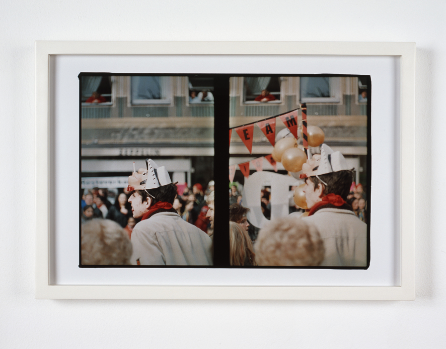 The “two frame’ photograph series developed whilst I was on residency in Bamberg, Germany in 2006. A photographer friend used to loan me cameras when I was away on trips. Mostly I would borrow small and light cameras from him, the results were average, nothing more or less than documentation, I did not feel much affinity with the photographs I brought back. Then after several years of this proceedure something quite shocking happened. I had borrowed an Olympus Pen F- a half frame camera first introduced in the Sixties. I made some tests on an old colour negative fujifilm with the camera. I took portraits of my fellow residents in Bamberg and filled the rest with shots of a parade celebrating a traditional catholic ritual. Some months later I took the film to an over the counter photolab to be processed, the results which came back surprised and fascinated me. For a start there were two images in each frame (due to the fact that the lab did not have the correct framing to print this obsolete format). There were some other special qualities too; the white space around the image, the black dividing line and frame lines that were always slightly different, creating a sense of tension These factors, in combination with the century old ritual that I documented , made it difficult to place the date in which the photographs were taken.